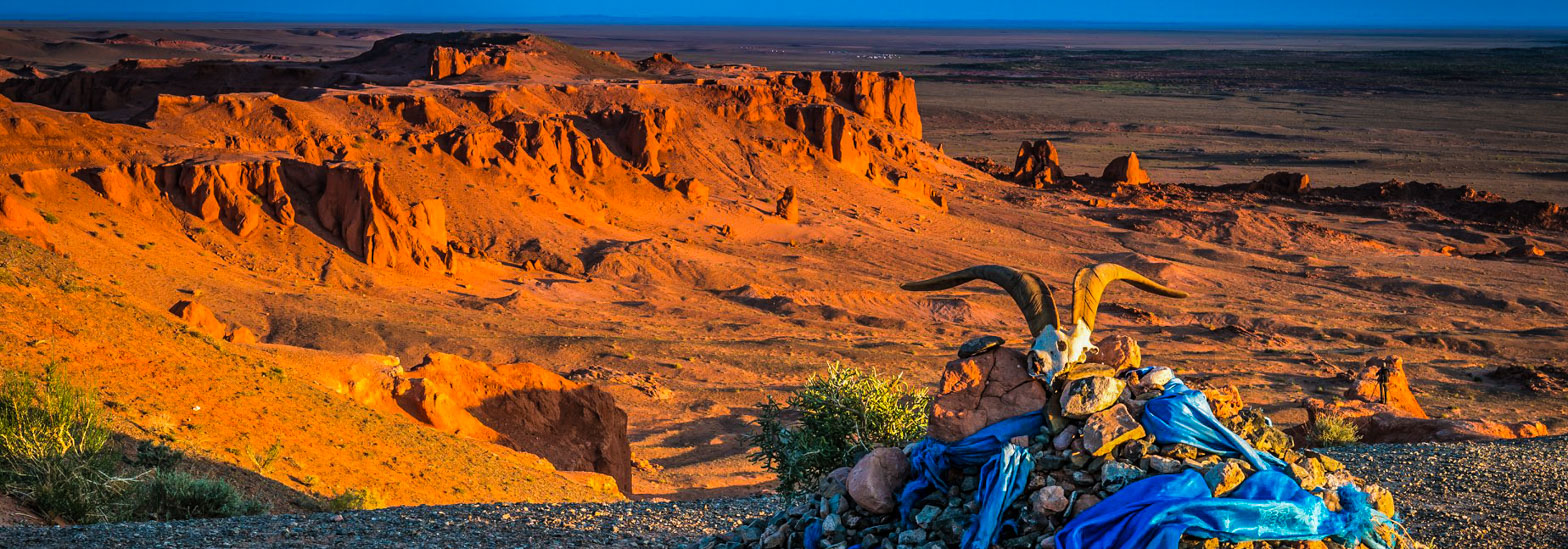 Begin your day with a scenic drive to Bayanzag, also known as the "Flaming Cliffs," for its remarkable red soil that radiates in the sunlight. Marvel at the famous dinosaur fossils and eggs dating back to the Cretaceous period. Next, head to Ongiin Khiid, a historic Buddhist Temple established in 1660 in the Dundgovi province. Discover the rich cultural heritage of the temple that once housed over 1000 monks and 4 Buddhist universities. Witness the rebuilding efforts of the temple after its destruction in the 1939 purges. Enjoy a delicious lunch at a local ger camp and spend the afternoon exploring the Ongy Monastery and its museum. End the day by taking in the breathtaking sunset from the top of the Saikhan Ovoo Mountain. Rest easy at the cozy ger camp for the night. (B/L/D)